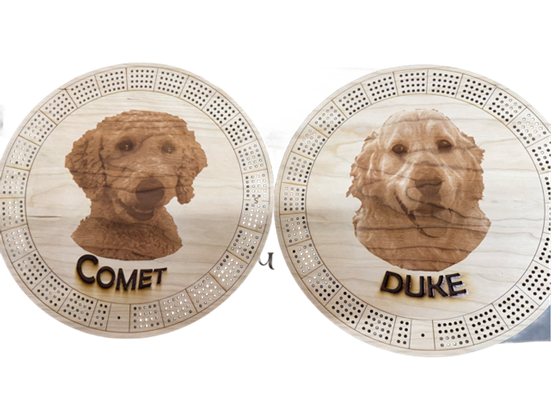 Discover the joy of friendly competition with our 4-person cribbage boards, designed to bring people together for hours of fun. Crafted from high-quality wood and featuring beautifully engraved details, these boards are perfect for game nights, family gatherings, or casual get-togethers. With space for four players, everyone can join in on the excitement, making it an ideal addition to your game collection. Whether you're a seasoned cribbage player or new to the game, our boards offer a stylish and functional way to enjoy this classic pastime. Elevate your game nights and create lasting memories with our 4-person cribbage boards. This a custom cribbage board where may users engrave a picture of their family dog.